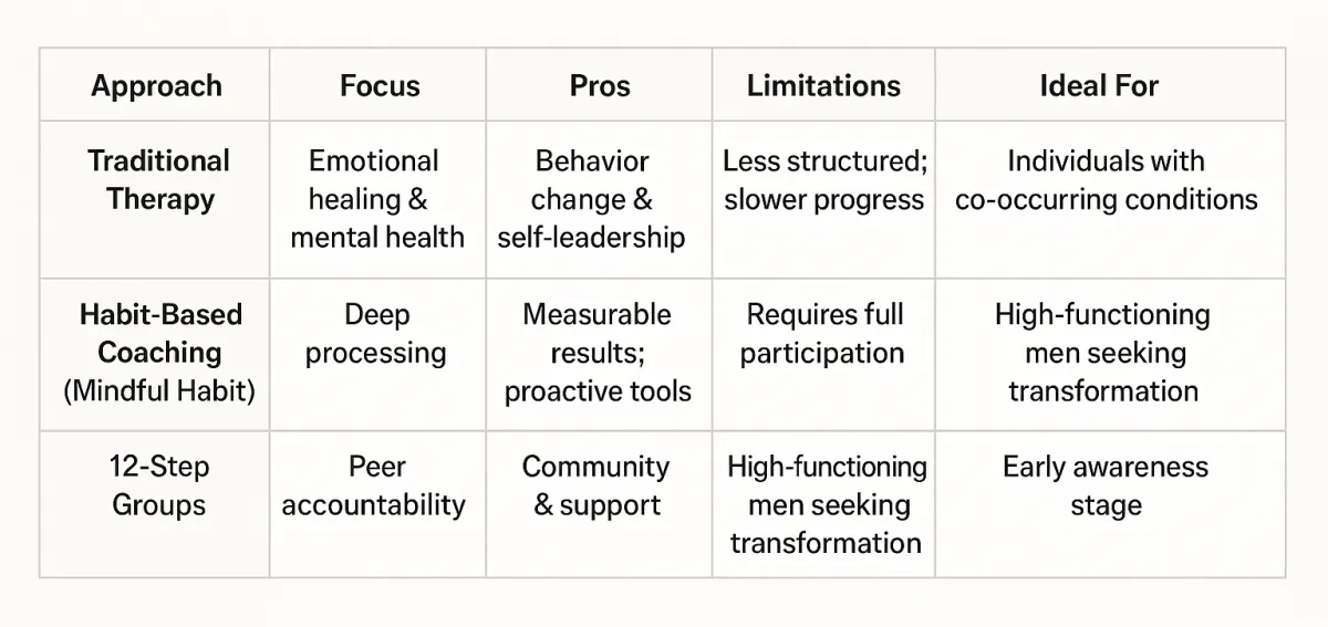 Online therapy might be a once-a-week session. You probably won’t use habit trackers, digital journals, and emotion logs to create daily accountability — rewiring your brain in real time. These tend to be primarily coaching modalities but all porn addiction therapists are different.